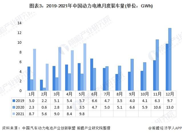 新能源汽车销量快速增长带动了动力电池装车量的增长。2021年5月,我国动力电池装车量共计9.8 GWh,同比增长178.2%。新能源汽车对动力锂电池需求量的增长,动力电池企业订单火爆。