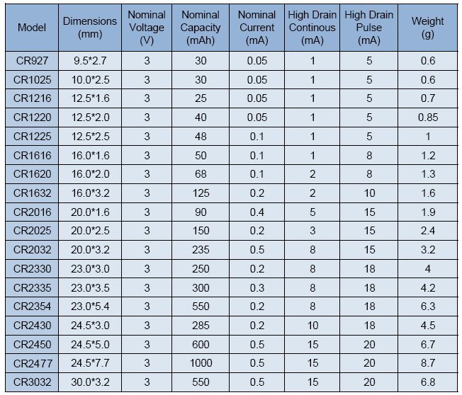 标称电压:3.0V尺 寸:12.5*2.5(mm)标称容量:48mAh标称电流:0.1mA最大连续电流:1.0mA最大脉冲电流:5.0mA重 量:0.7g
