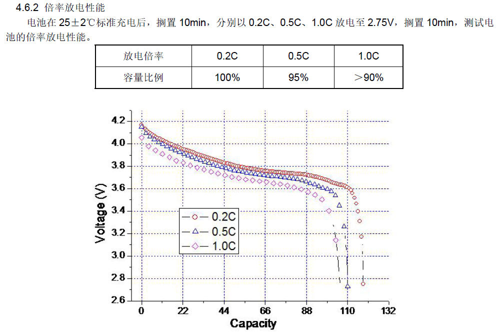 电池容量是指在环境温度 20±5℃的条件下,以 0.5CmA 恒流充电,当电池端电压达到充电限制电压 4.20V 后,放置不超过 1 小时,再以 0.5CmA 电流恒流放电到 2.75V 所测的容量。
